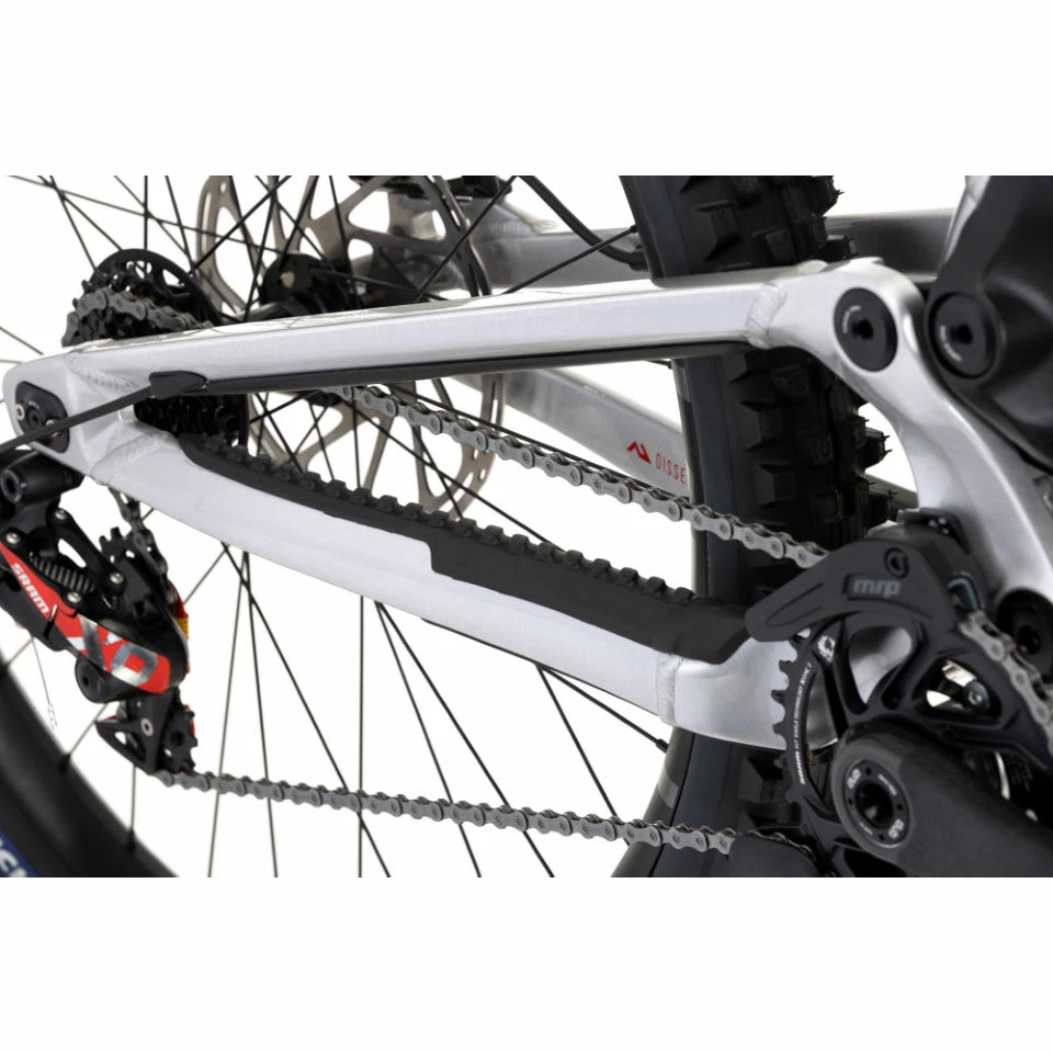 The Nukeproof Dissent 297 RS Alloy Bike (XO1 DH) rolls upon a mixed-wheel standard with a 29" at the front and 27.5" at the rear. It is also equipped with RockShox Ultimate DH long-travel suspension and a SRAM XO1 DH 7-Speed groupset.